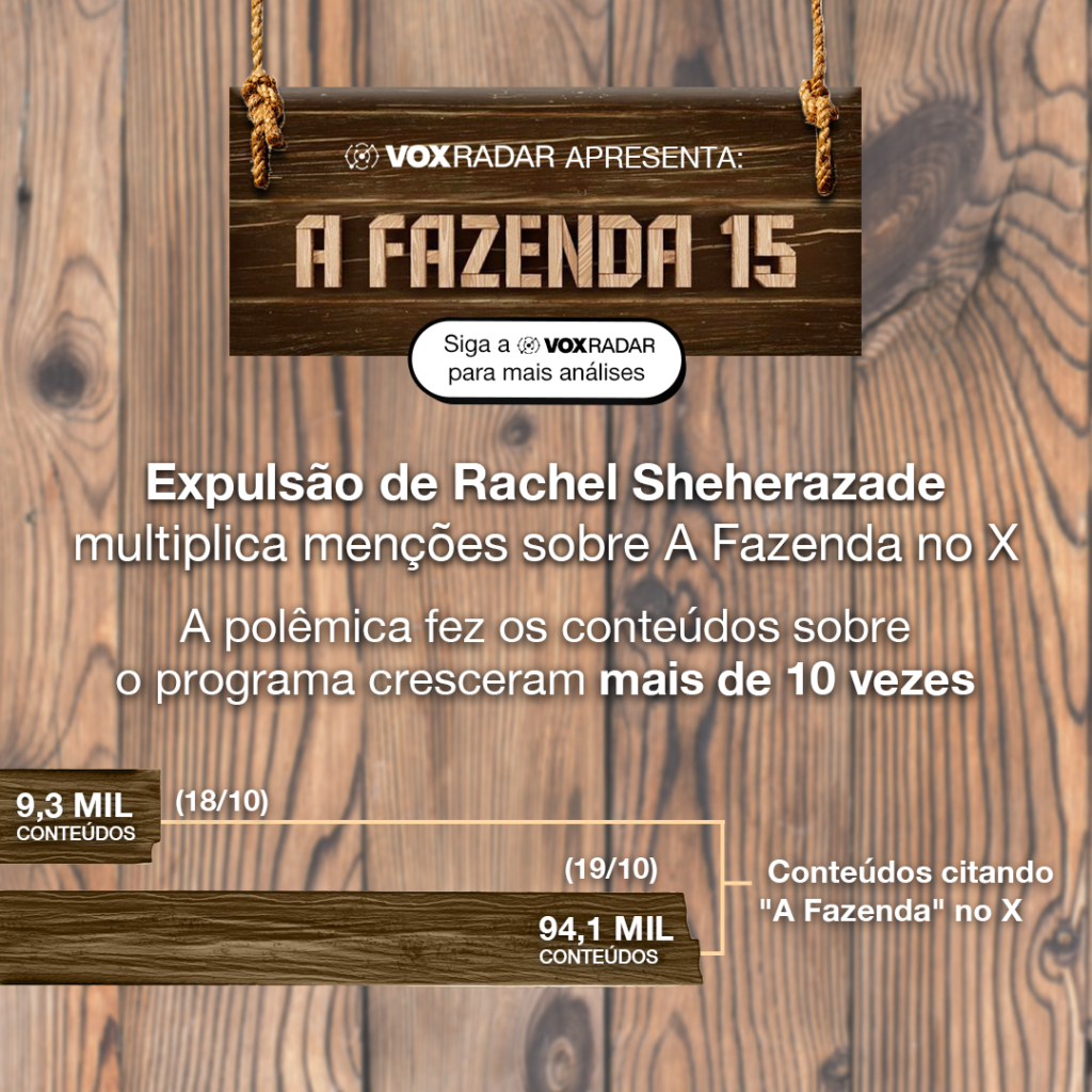 Mesmo quem não acompanha A Fazenda se deparou com algum conteúdo sobre a expulsão da jornalista Rachel Sheherazade. Então, a Vox Radar resolveu verificar o impacto da saída da “peoa” nos posts e compartilhamentos sobre o reality show da Record TV no X (antigo Twitter).