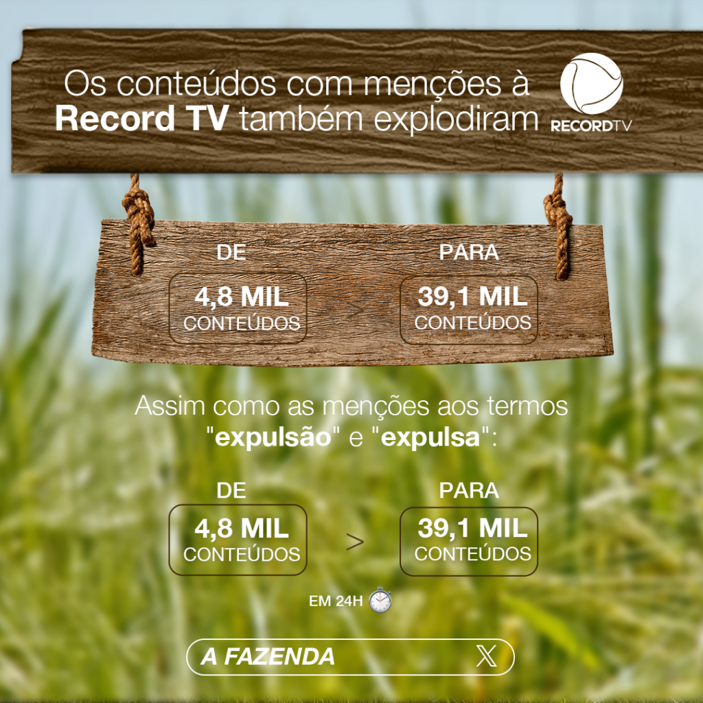 No embalo do seu principal programa do momento, a Record também foi muito mais mencionada, com oito vezes mais conteúdos, na comparação com o dia anterior à expulsão.
