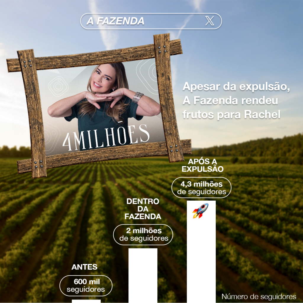 Após sair de A Fazenda, Rachel Sheherazade conseguiu somar novos seguidores, dobrando a quantidade que tinha quando ainda estava dentro do reality show. Desde que entrou no programa, ela aumentou em mais de sete vezes o total de usuários em seu Instagram.