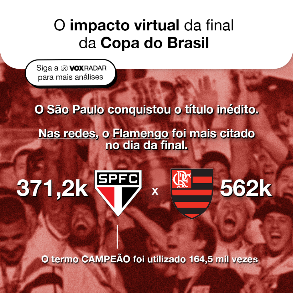 Nas redes, porém, o mais citado ao longo do dia da final foi o Flamengo. Dono da maior torcida do Brasil, o clube carioca gerou mais engajamento dos seus torcedores e, claro, dos adversários. O Tricolor Paulista somou 371,4 mil menções, entre postagens originais e compartilhamentos, enquanto o Rubro-Negro Carioca totalizou 562 mil conteúdos.