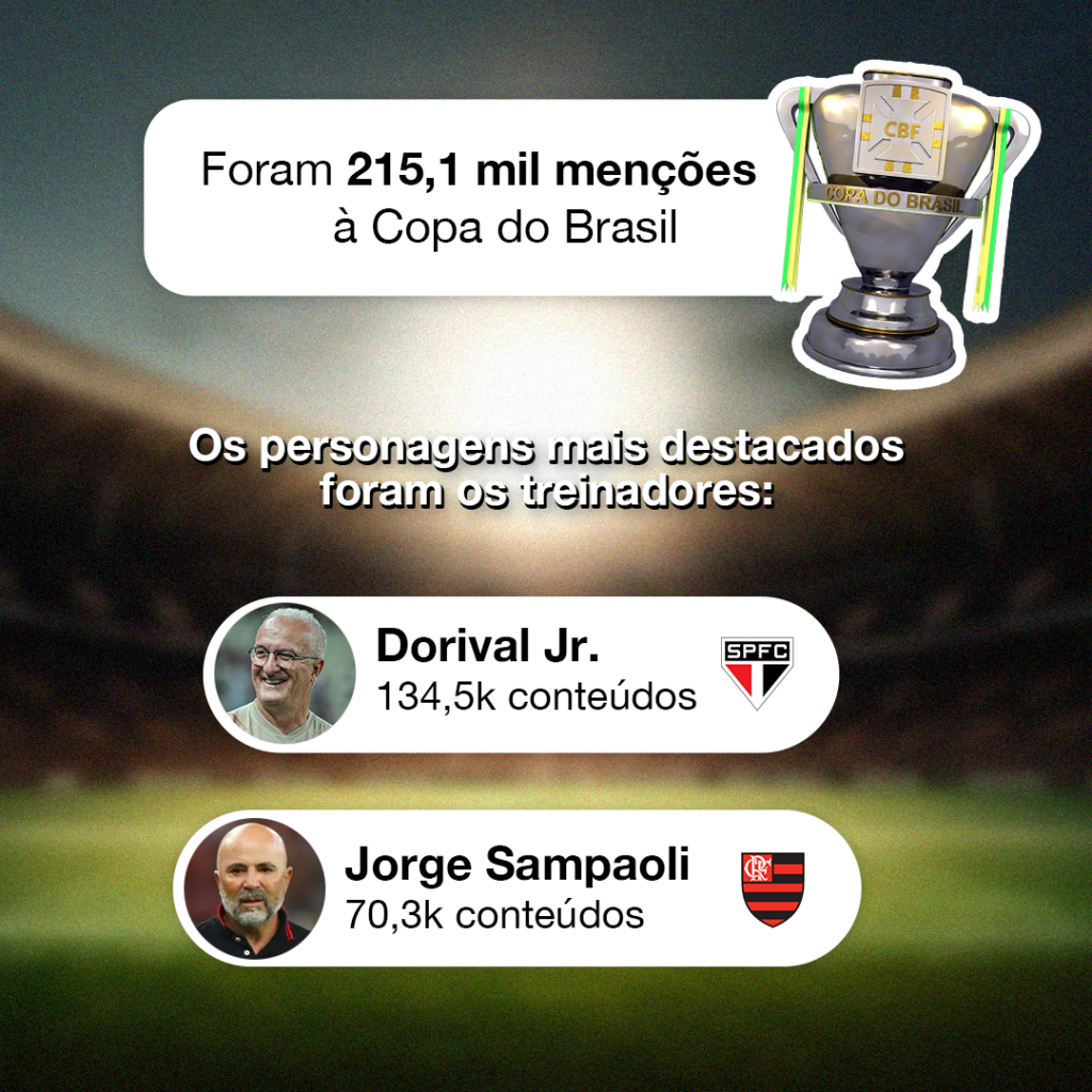 Ao todo, foram 215 mil menções à Copa do Brasil. Entre os que construíram a final, os treinadores foram os mais destacados. Dorival Jr., atual comandante do São Paulo e ex-técnico do Flamengo, liderou, com quase 135 mil conteúdos. Muitos deles criticando o clube carioca por ter demitido Dorival.