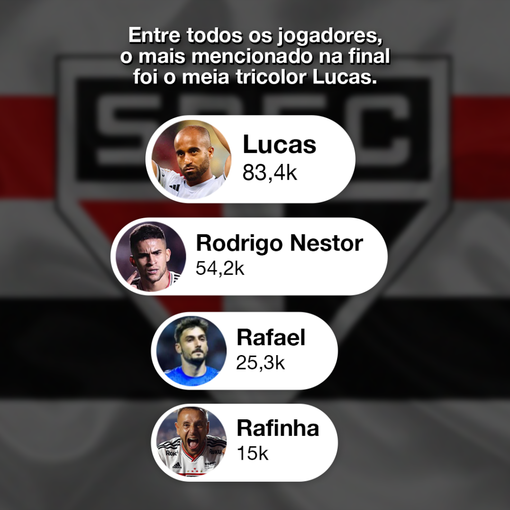 Formado nas categorias de base do São Paulo, o meia Lucas voltou em 2023 e já foi campeão. Nas redes, ele também foi detaque, sendo o jogador que gerou mais conteúdos, entre os dois times, com mais de 80 mil.