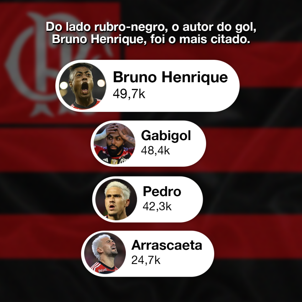 No time carioca, o líder em conteúdos foi o atacante Bruno Henrique, autor do gol flamenguista na final da Copa do Brasil. Em seguida, aparece Gabigol, que começou a partida como reserva, e Pedro, também atacante, que iniciou o jogo justamente na vaga de Gabigol. Os três atletas ultrapassaram a marca de 40 mil postagens e compartilhamentos.