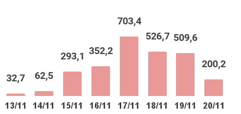 Porém o teor negativo tomou conta do evento que era tão esperado há meses. A produtora T4F, por exemplo, foi citada em 581,4 mil conteúdos entre a sexta-feira (17/11) e a segunda (20/11). O pico de menções foi de 1h da manhã do sábado (18/11), justamente quando veio a público o que ocorreu com Ana Clara.