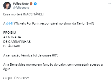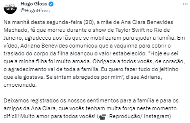 A repercussão começou positiva para Taylor Swift, com direito a uma homenagem no Cristo Redentor, que gerou cerca de 150 mil conteúdos. O dia com mais menções, no entanto, foi o sábado (18/11), com 703,4 mil do total de conteúdos. Naquele dia, tomou conta do X o debate em torno da estudante Ana Clara Benevides, que faleceu por uma parada cardiorrespiratória, após passar mal no Estádio do Engenhão, local do show