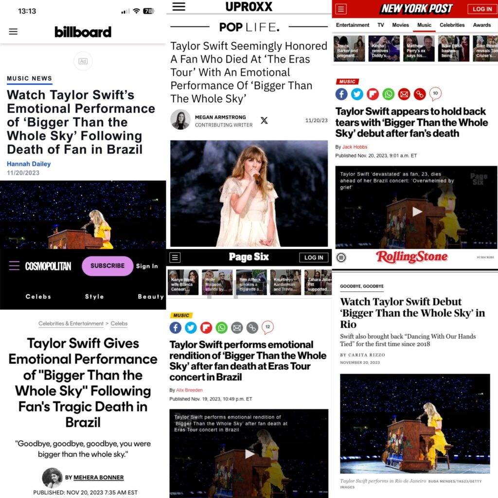 Domingo e segunda também registram números expressivos de conteúdos sobre Taylor, ambos com mais de 500 mil, dividindo-se entre quem, mesmo com todas as questões, ainda se sentiu realizado com o show, mas também por fãs e pessoas decepcionados criticando a falta de apoio da cantora com a família da vítima.