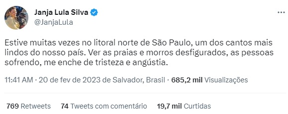 A repercussão da tragédia climática que deixou, até o momento, 48 mortos no litoral norte de São Paulo teve grande conotação política no Twitter. O presidente Lula, o governador Tarcísio de Freitas, o ex-presidente Jair Bolsonaro e até a primeira-dama, Janja, foram personagens nas publicações sobre as fortes chuvas que atingiram a região.