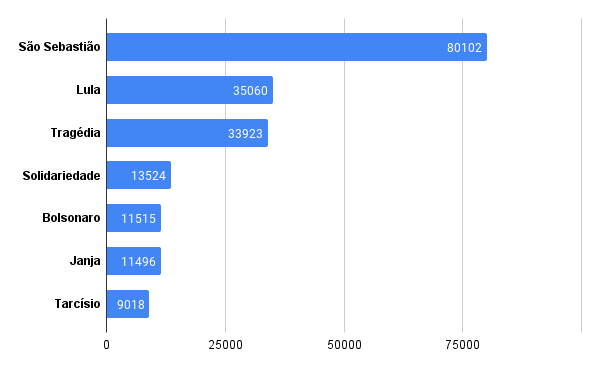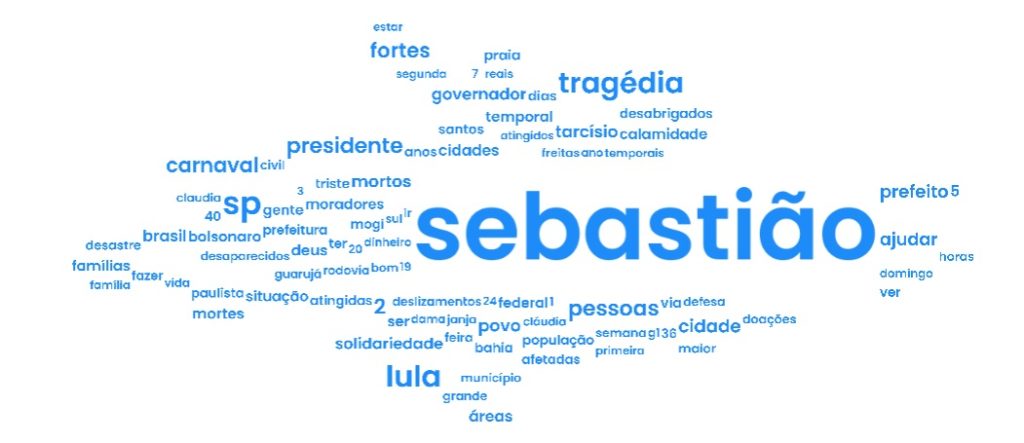 ‘Sebastião’, inclusive, foi o termo mais repetido nas publicações sobre o caso. Na análise, a Vox Radar buscou nomes políticos que constaram nas postagens e ainda contextos, como tragédia – relacionados às postagens sobre as mortes e resgates – e solidariedade, referentes às doações para moradores e buscas para auxílio.