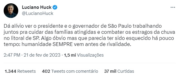 Em seguida, houve destaque para uma postagem do apresentador Luciano Huck, que ressaltou a união entre Lula e Tarcísio para atuar no caso.