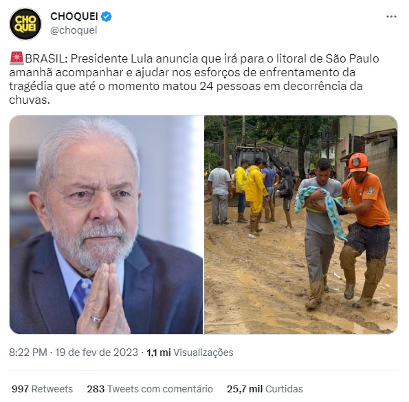Postagem do prefeito de São Sebastião mencionando Lula foi o conteúdo com mais interações no contexto da tragédia