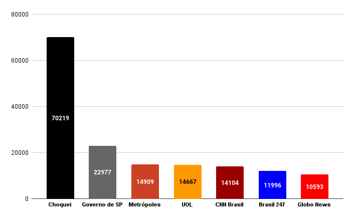 Além de ter duas das cinco publicações com mais interações, a Choquei também registrou mais engajamento do que a soma das cinco páginas de empresas de comunicação que contaram com mais interações noticiando a tragédia. O levantamento da Vox Radar contabilizou apenas os números das três postagens da Choquei que mais movimentaram o Twitter sobre o caso.